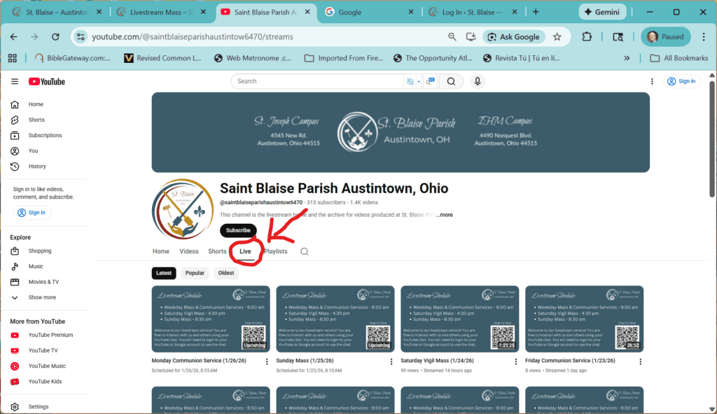 You can view our livestream on our YouTube page. Click Here to access our YouTube page. Usually 10-15 minutes before the start of a weekend Mass or 5 minutes before the start of a weekday Mass or communion service, you will see a red LIVE button on the video that is currently streaming. Click on that video to access the livestream. This image below has a red arrow showing exactly what menu item to click if you can’t find the video: